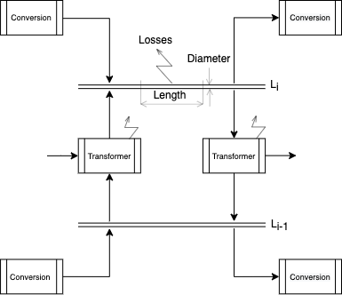 The conversion technologies, as producers or consumers, connect to predefined levels in the grid infrastructure. Transformers allow connections between different grids within the same infrastructure. For each grid, the length and capacity are calculated, defined as the maximum power it can transfer, which is converted into a diameter of pipe or cable to install. Each grid has a loss model representing distribution losses (see Figure 1). The infrastructure cost is calculated as a function of the installed capacity and the grid length. Additionally, transformation losses and energy recovery are considered for transformers. Table 1 presents the different grids considered in this study.